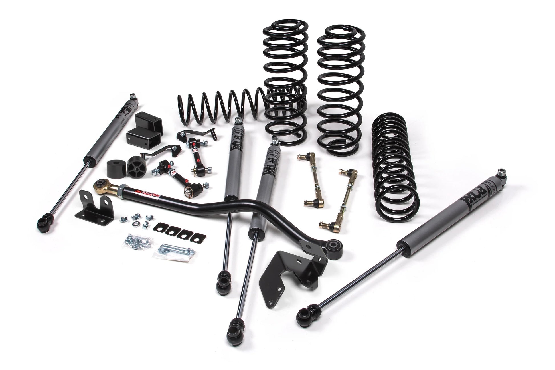 Increase ground clearance and tire clearance on your Diesel 4 Door JL Wrangler's with a 3.5" lift J-Venture suspension system. You get the perfect balance of on and off road capability plus low maintenance. J-Venture lift kits include dual rate front and rear coil springs, specifically-valved gas shocks, a front adjustable track bar, rear track bar bracket, front sway bar Quicker Disconnects, bump stop extensions, and front caster lock plates to dial in geometry. The engineers at JKS custom tune shocks and matching springs to significantly improve ride quality and handling on road, as well as performance off-road. An adjustable track bar helps center the front axle while the Quicker Disconnects improve articulation off-road. Get out and explore with J-Venture.