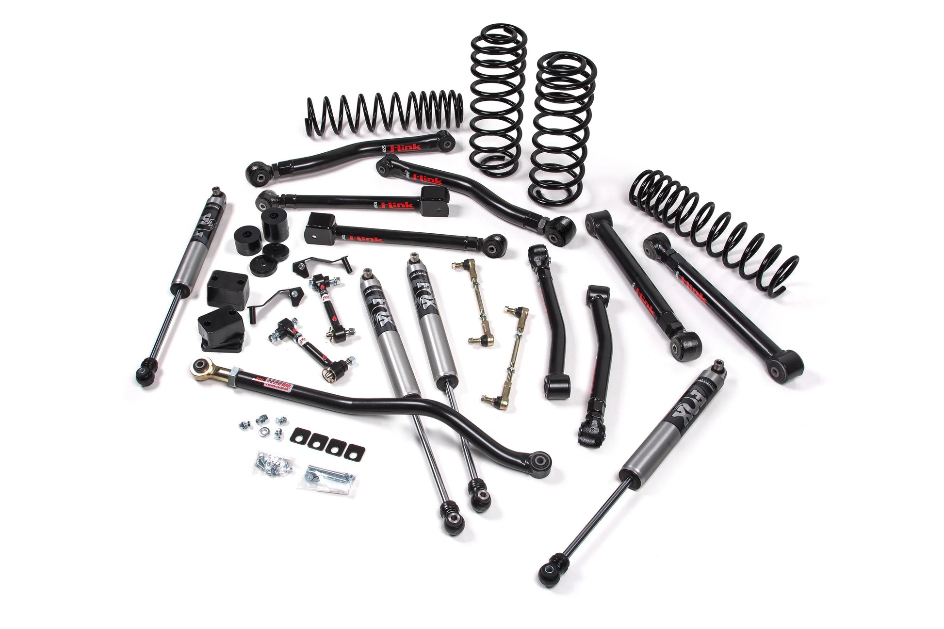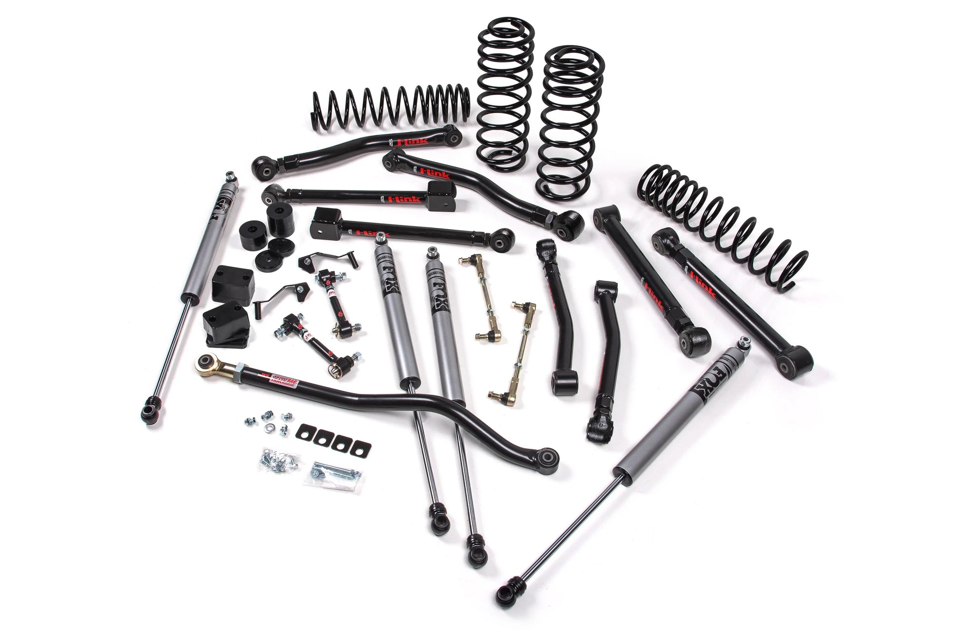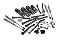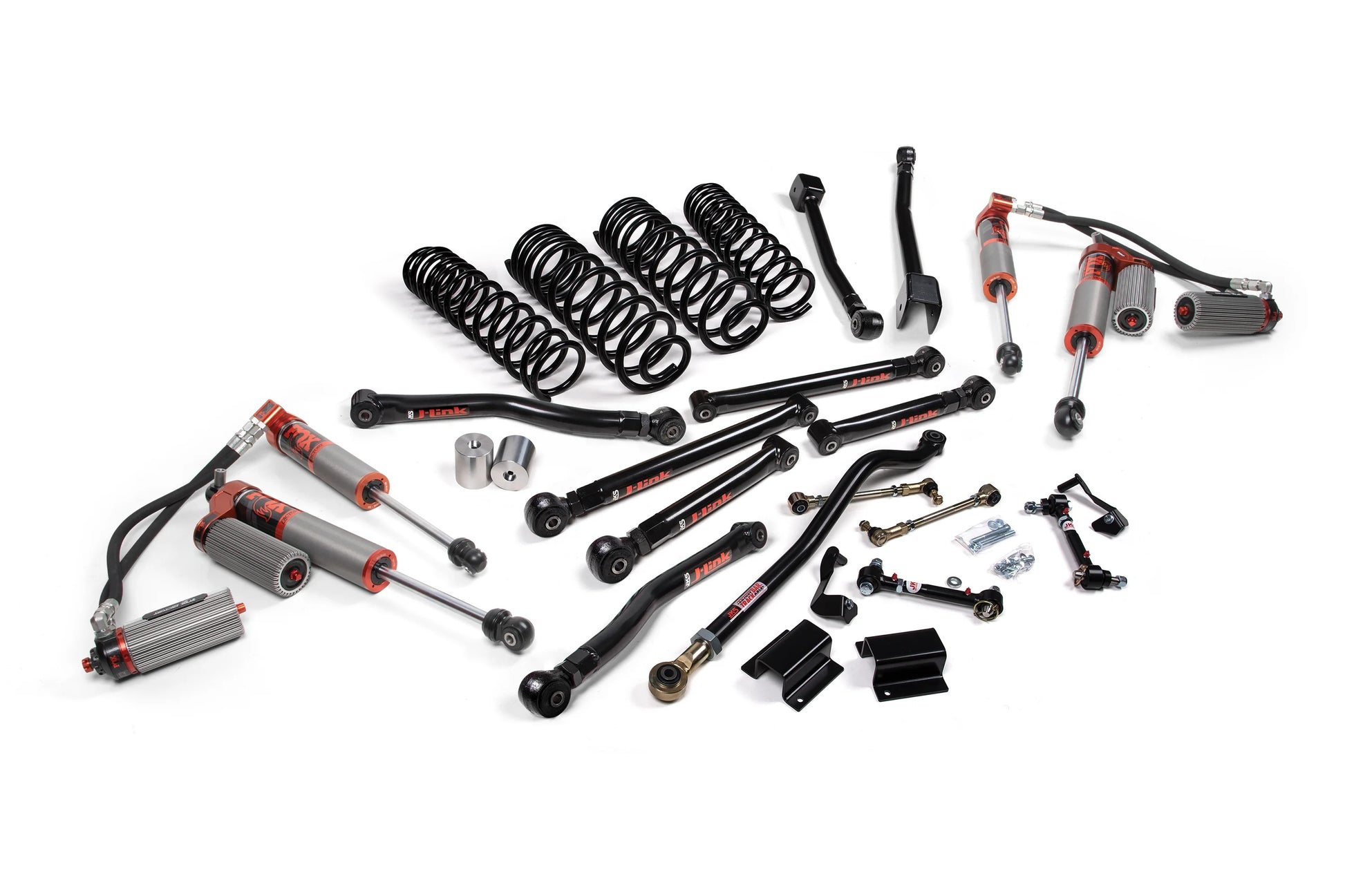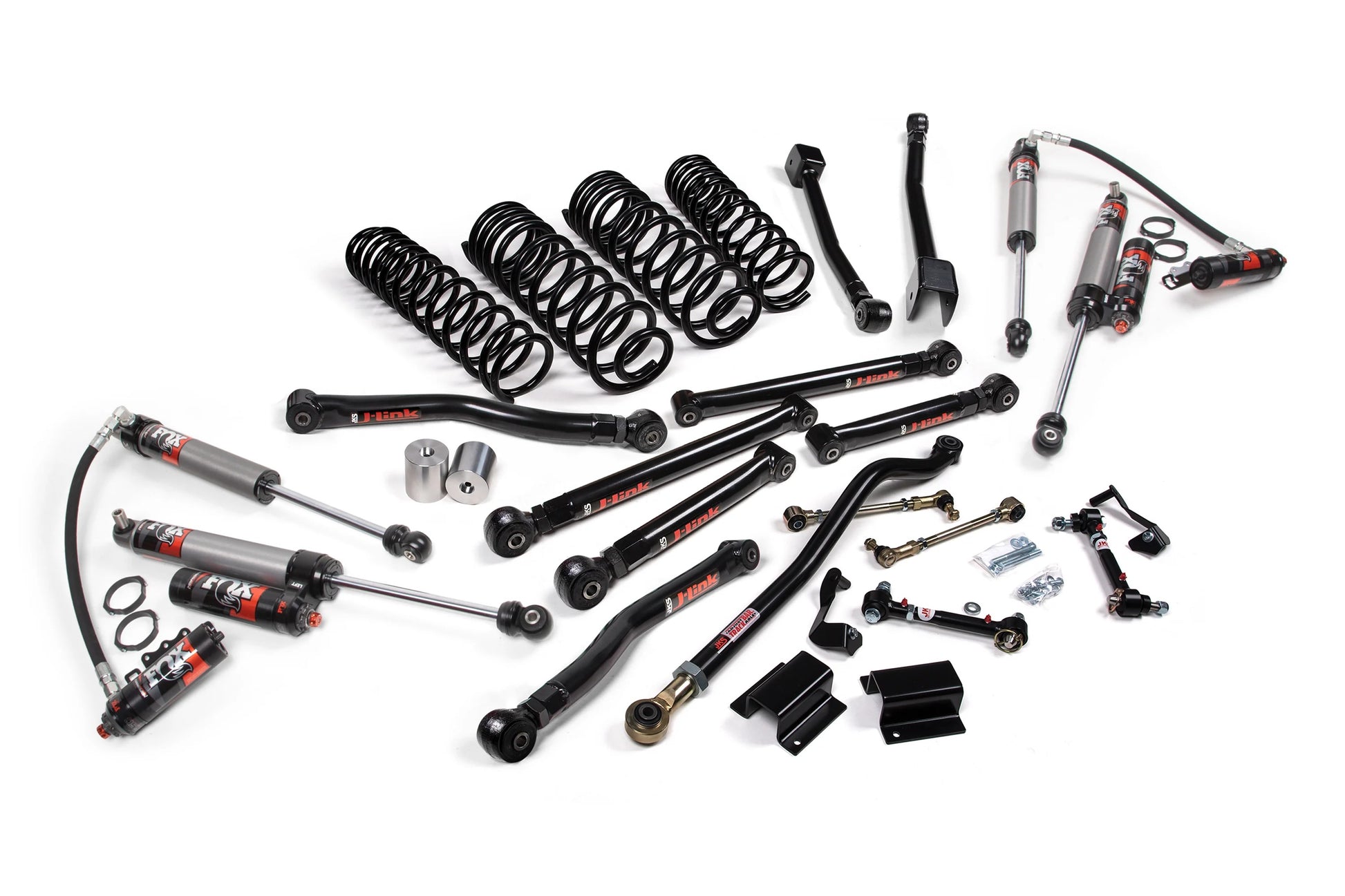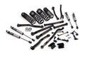 To maintain proper suspension geometry and handling, the kit includes a front adjustable track bar and rear track bar bracket to keep the axles centered, along with extended sway bar links for improved articulation. Bump stop extensions are included to prevent over-compression, while brake line relocation brackets ensure safety and functionality at full suspension travel. Designed for Jeepers who crawl technical terrain and demand a fully tunable suspension setup, this kit supports up to 37" tires and is compatible with both stock and aftermarket driveshafts (aftermarket recommended for extreme off-road use).